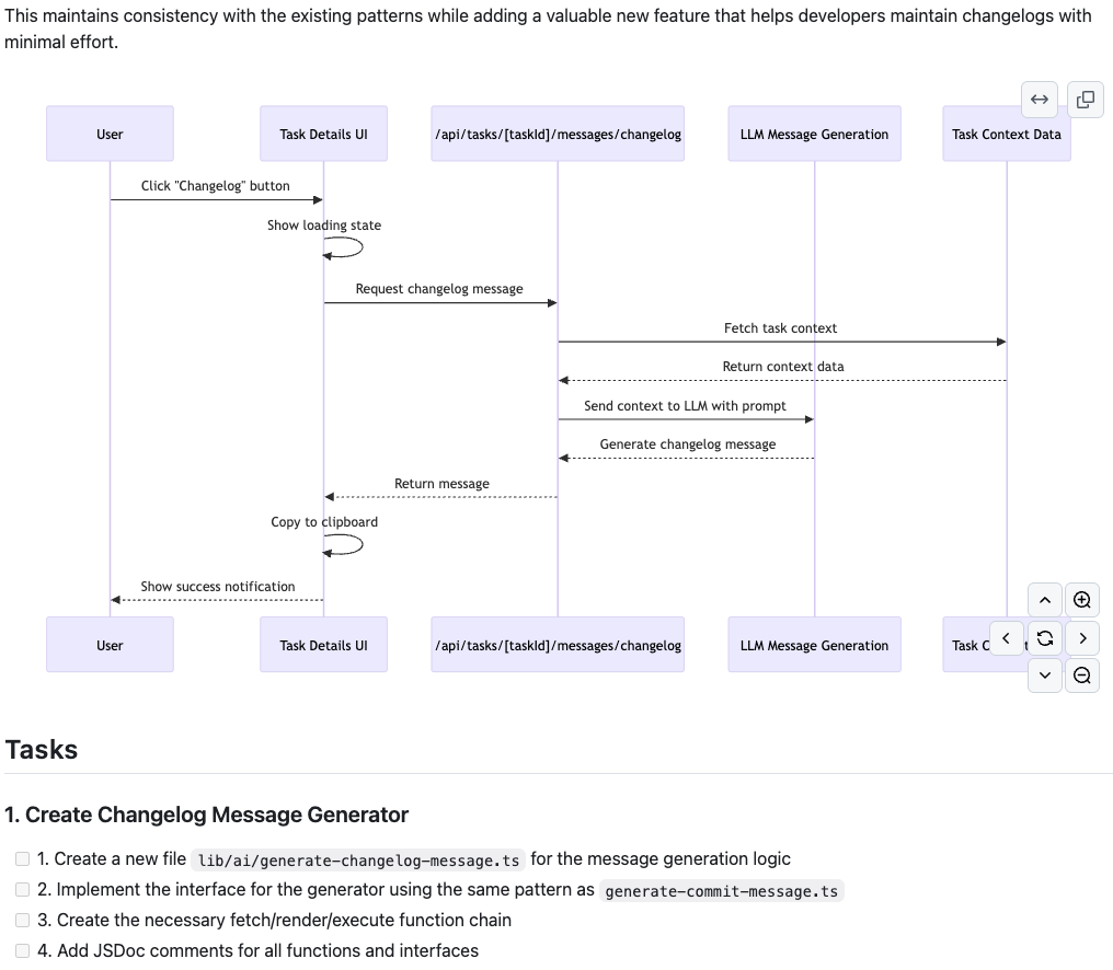 The plan document the Claude spit out includes a lovely diagram, and numbered tasks, which is cool. It largely went along with the instructions we gave it, and it took about 2 minutes to complete the document.