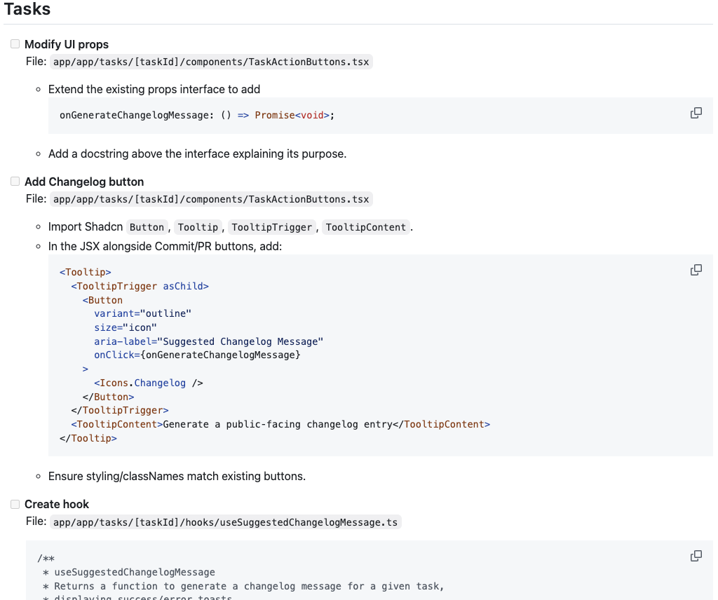 - tasks - the 2-sentence ticket descriptions to turn into plans
