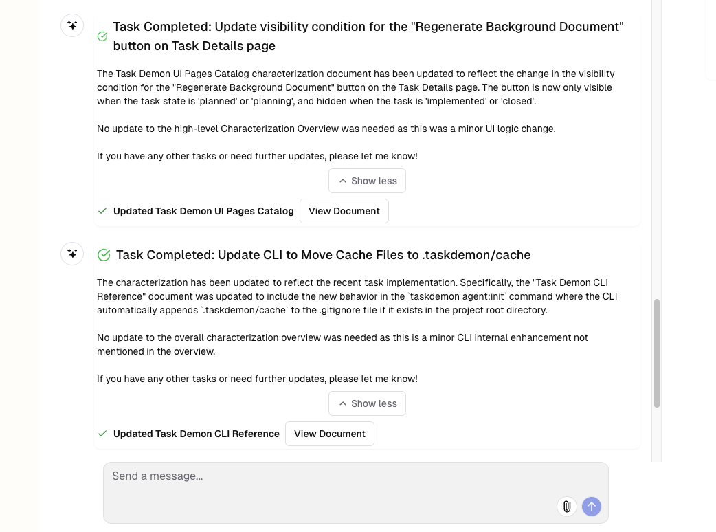 Characterization is part of the secret sauce that makes Task Demon do what it does so well. And today, Characterization becomes Continuous Characterization, automatically updating your Characterization documents as you implement tasks. This ensures that as you add new code to your codebase, your Characterization documents are always up to date, so Task Demon's Agents can continue to make the best possible decisions.